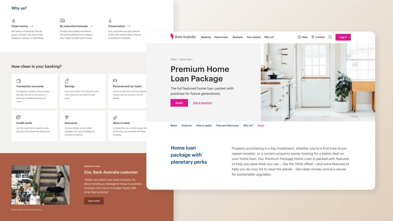 With the brand in a strong and clear place, Bank Australia was ready to develop a user-friendly website focused on accessibility, diversity, and financial inclusion. The aim was to ensure the site was easy to update and positioned the bank as a top choice for Australians who want to use their money for good. We had the privilege of playing the role of a kind of product lead, collaborating with partners such as Paper Giant for strategic design and user testing, WORDS for things for finance and content, Portable for digital development, Good & Proper for photography, and Melorium for analytics.