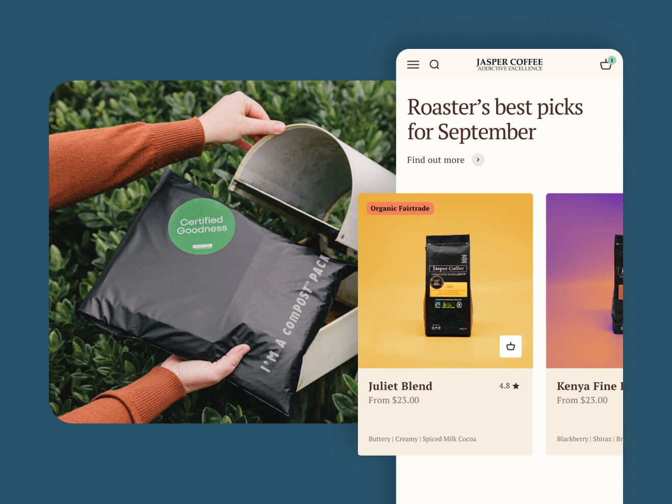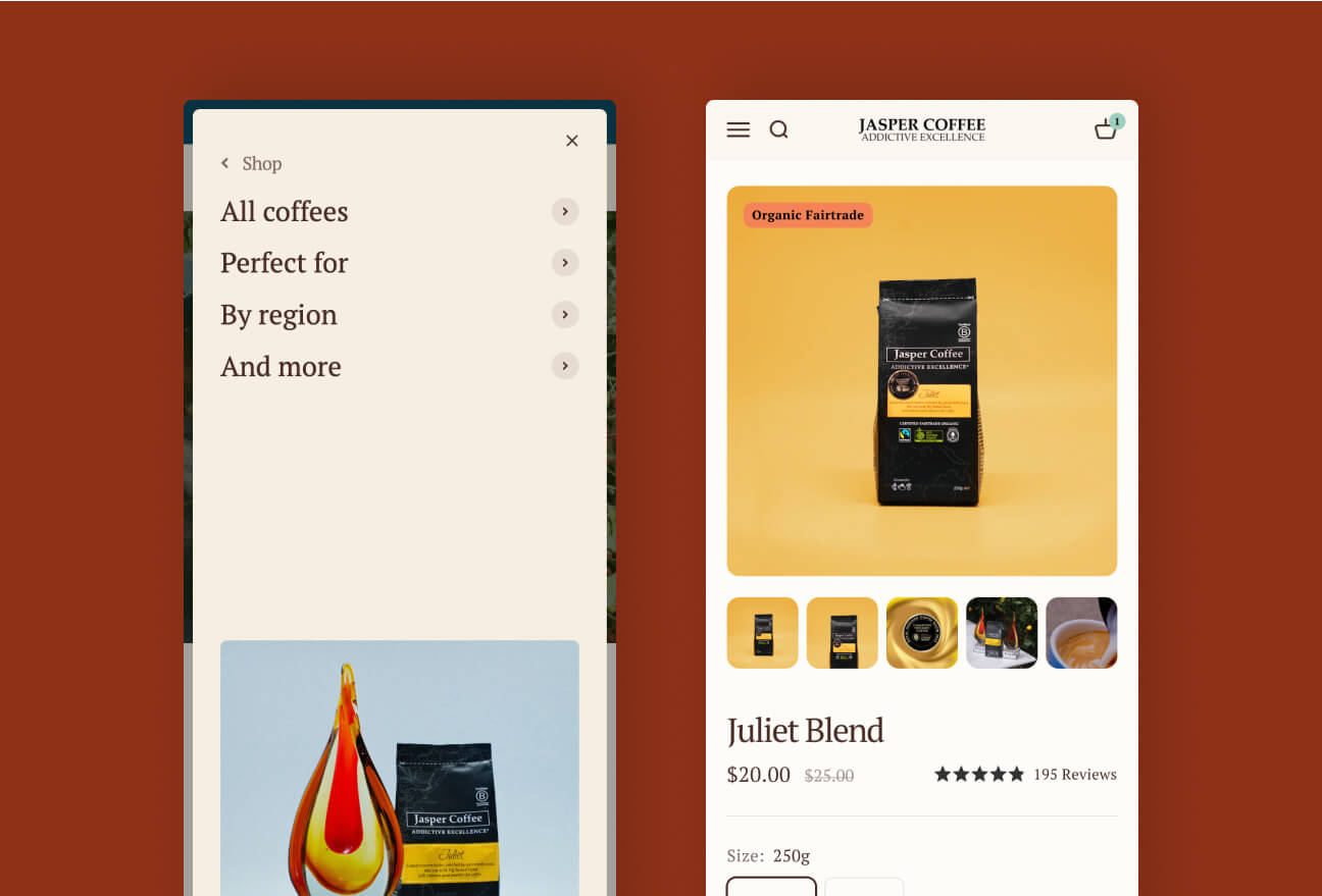 The updated theme and navigation delivers both: a product-first experience that meets customer needs, and an engaging platform that celebrates the people and principles behind every bean.