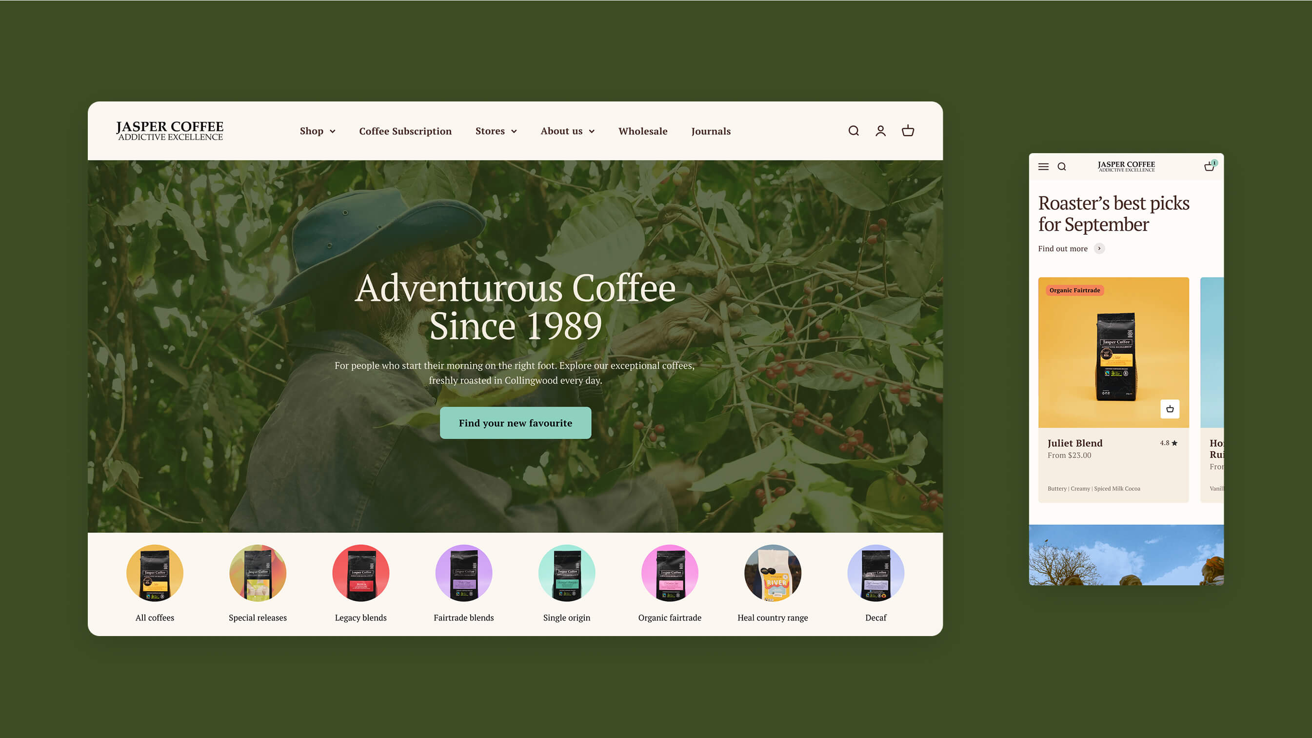 The new Jasper Coffee site is built around what matters mostâhelping customers find the coffee they love. From blends and single origins to curated subscriptions, every product page is clearer, faster, and easier to navigate.