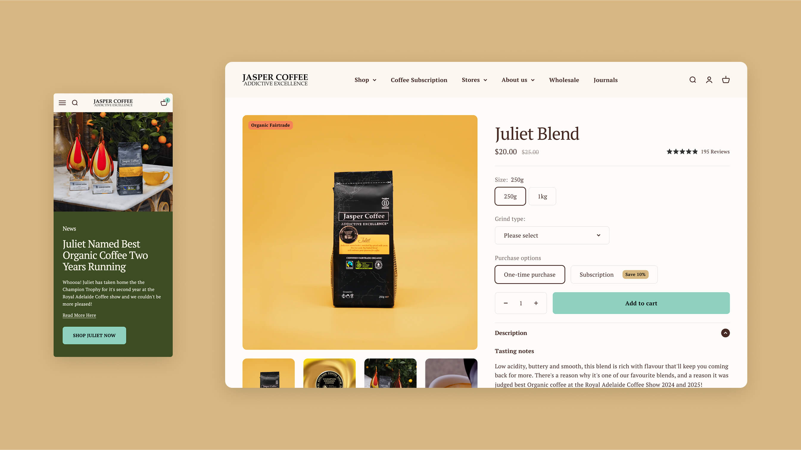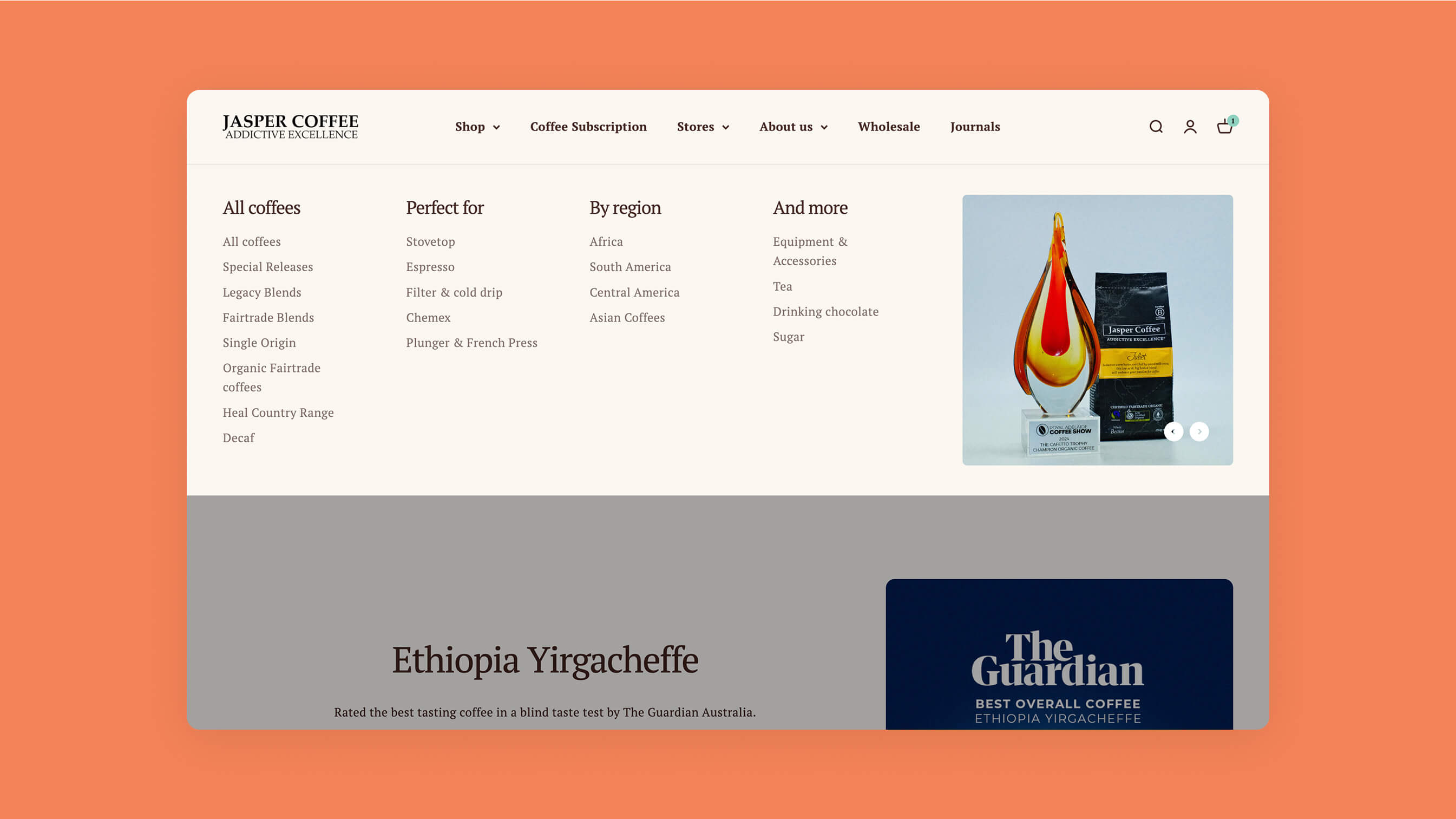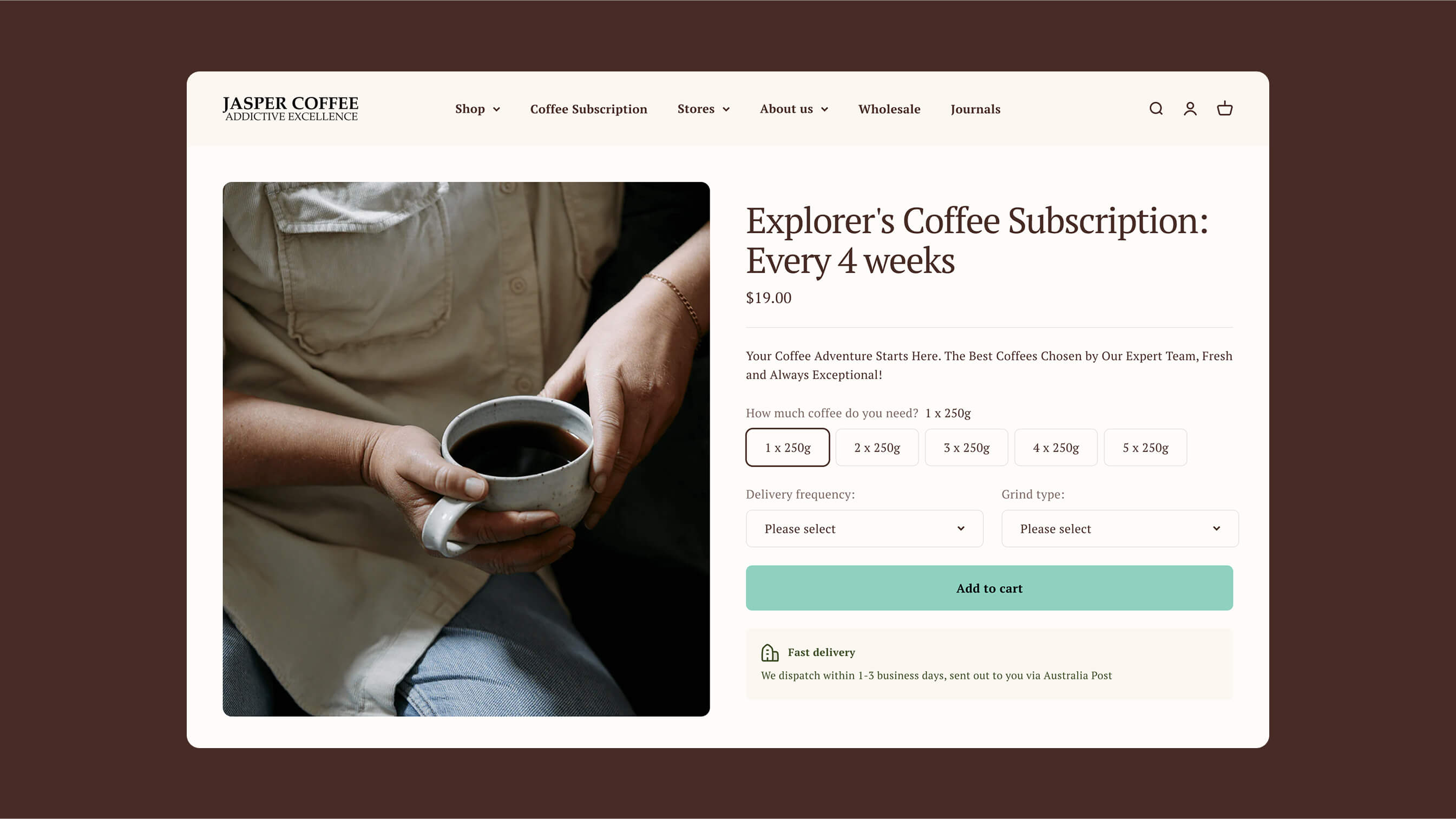 Jasper Coffee has always been about more than just coffee. With a pioneering approach to fairtrade, organic and carbon-neutral sourcing, their cafĂŠs and online store carry the ethos of âExploration. Adventure. Obsession.â But their digital presence was showing its age. The Shopify site was slow, dated, and weighed down by an old subscription app that no longer matched the needs of the team or their customers.