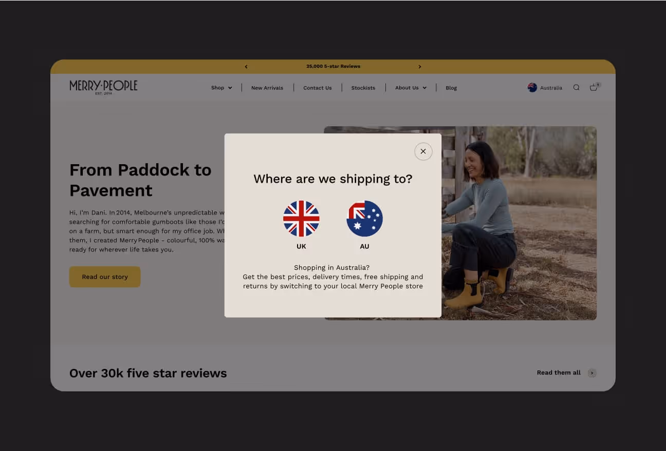 Providing customers clarity and choice as to where they want to shop with a targeted pop-up. Complimented with a flexible country / store / market dropdown redirecting the user to the equivalent page across each store.
