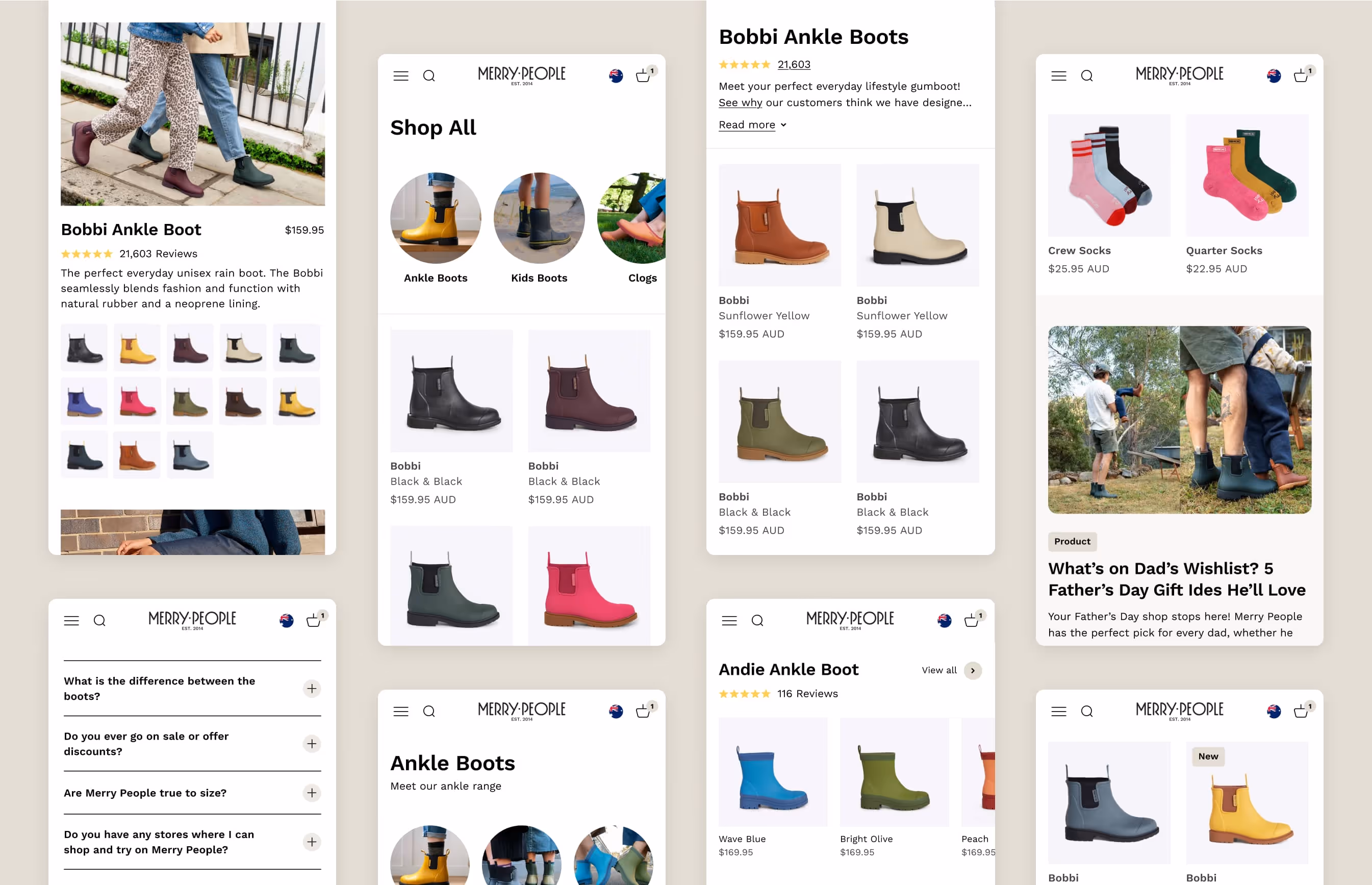 Collection Page upgrades:  Finding ways to make the Merry People range quicker to browse and easier to scan. Initial layouts were long and text-heavy. Explored concise product cards showing key details like price, reduced the overall page length, and added a top slider to give an instant overview of the range. We also tested different image styles, studio vs lifestyle, varied angles, to strike the right balance between clarity and brand warmth. Explored subtle motion (like a GIF or carousel) above the fold to bring the range to life, and introduced simple cues for heel height and scale without looking too cluttered.