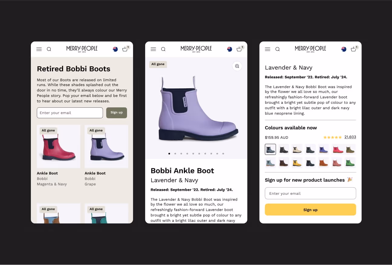 We created a dedicated section on collection pages to highlight retired products and designed a new product page template to drive newsletter signups for future launches. This showcased Merry People’s history while creating subtle urgency and excitement, resulting in higher CTR, CVR, add-to-carts, revenue per user, stronger SEO, and more signups.