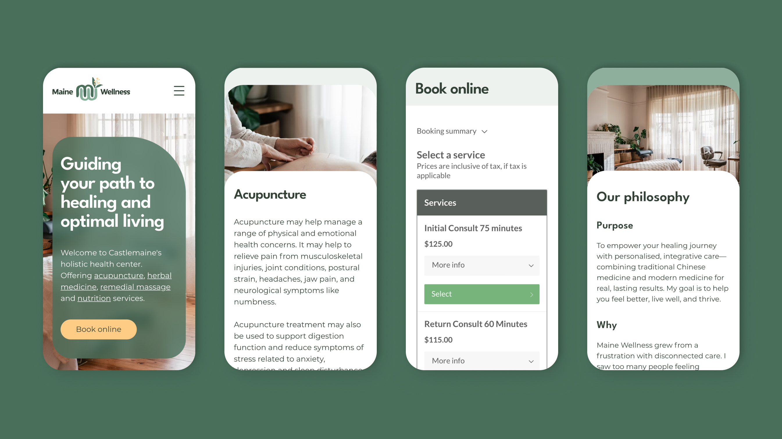 This project was intentionally designed as a lean and highly collaborative process. We partnered closely with Lee to co-create a brand strategy that reflected her philosophy and spoke directly to her intended audience. Together we clarified core values, articulated her purpose — empowering healing for a better you — and defined her value proposition of combining evidence-based medicine with the art of healing. The strategy culminated in a strong positioning statement and a new name, Maine Wellness, signalling her direction and connection to the Castlemaine community.