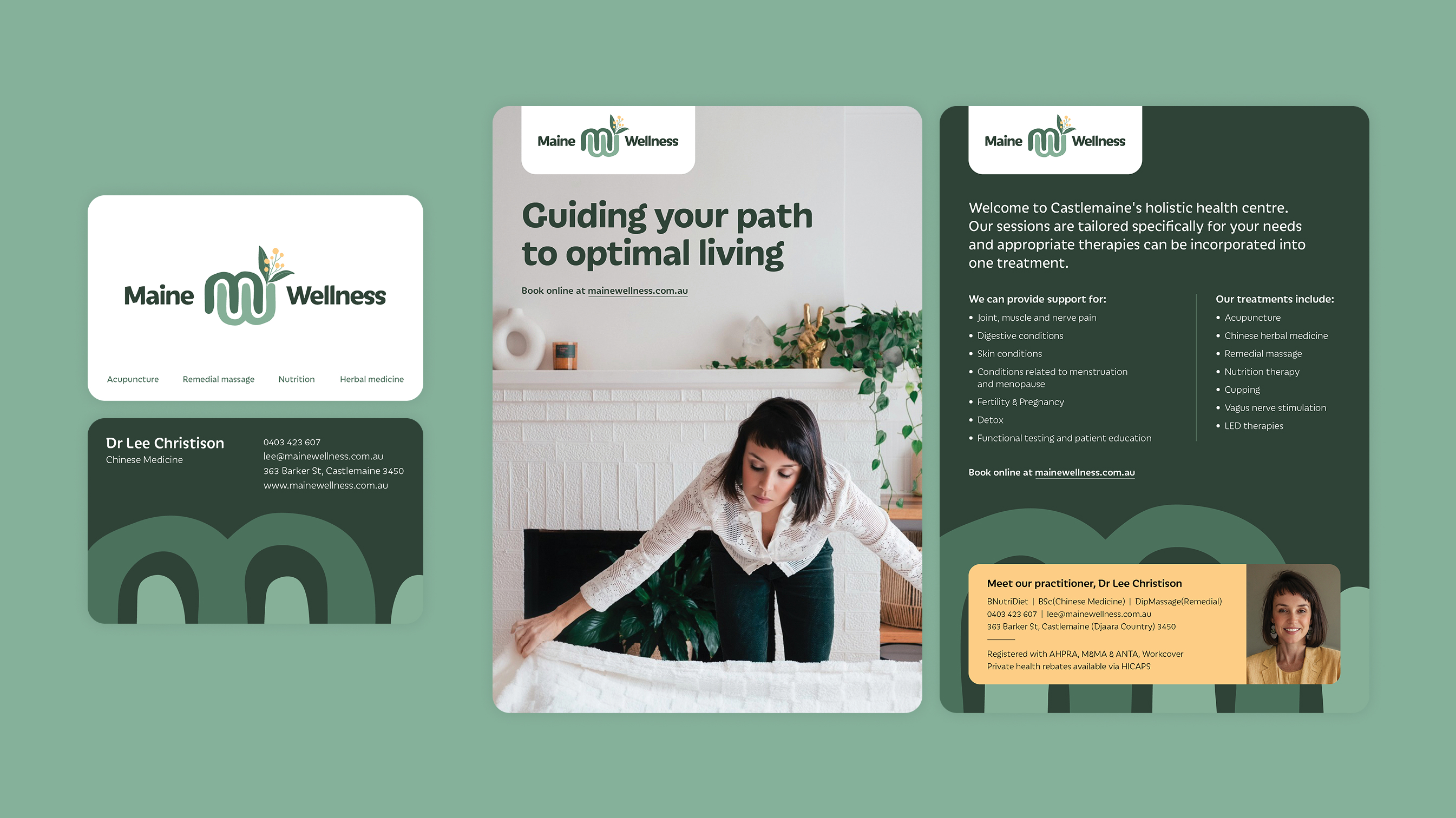 We transitioned Lee Christinson to Maine Wellness, positioning her as a unique, multi-modality practitioner. Rooted in Castlemaine, the brand reflects her evidence-based approach and connection to local community wellbeing.