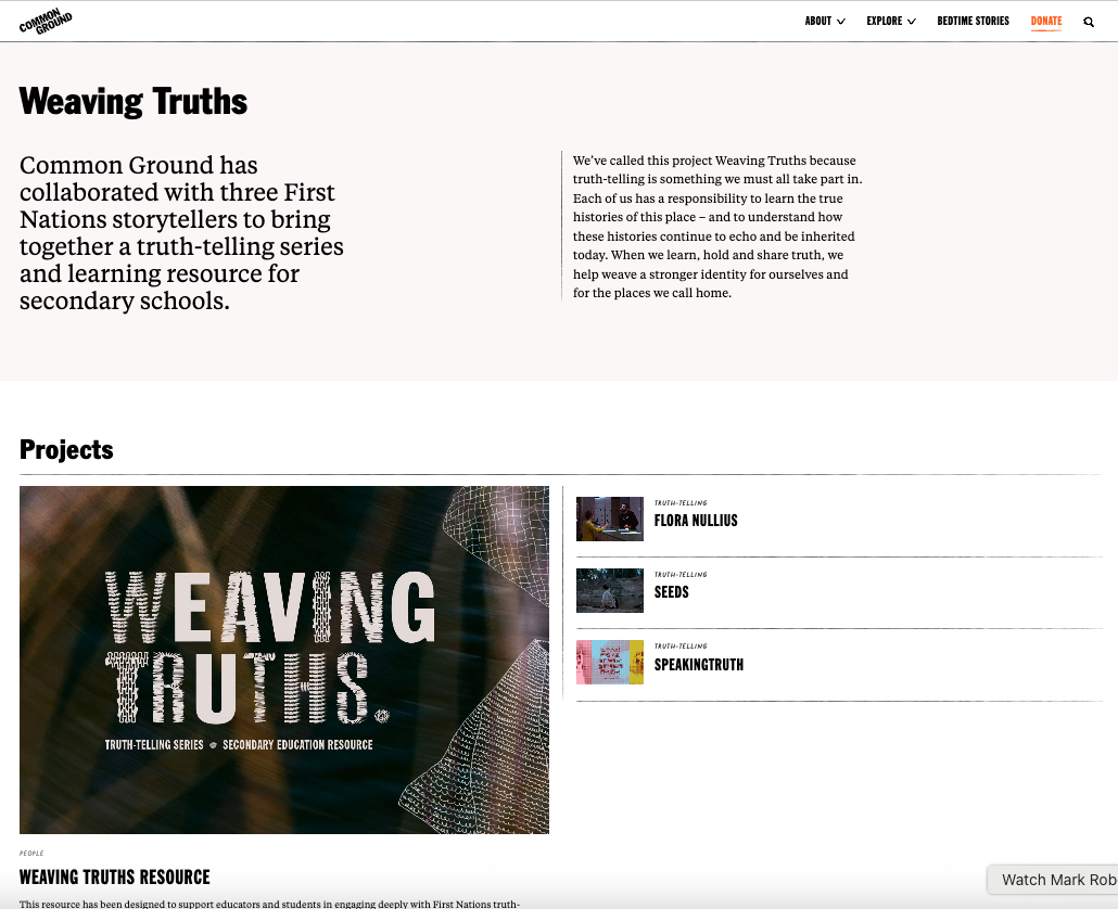 - Weaving Truths campaign - Common Ground has collaborated with three First Nations storytellers to bring together a truth-telling series and learning resource for secondary schools.