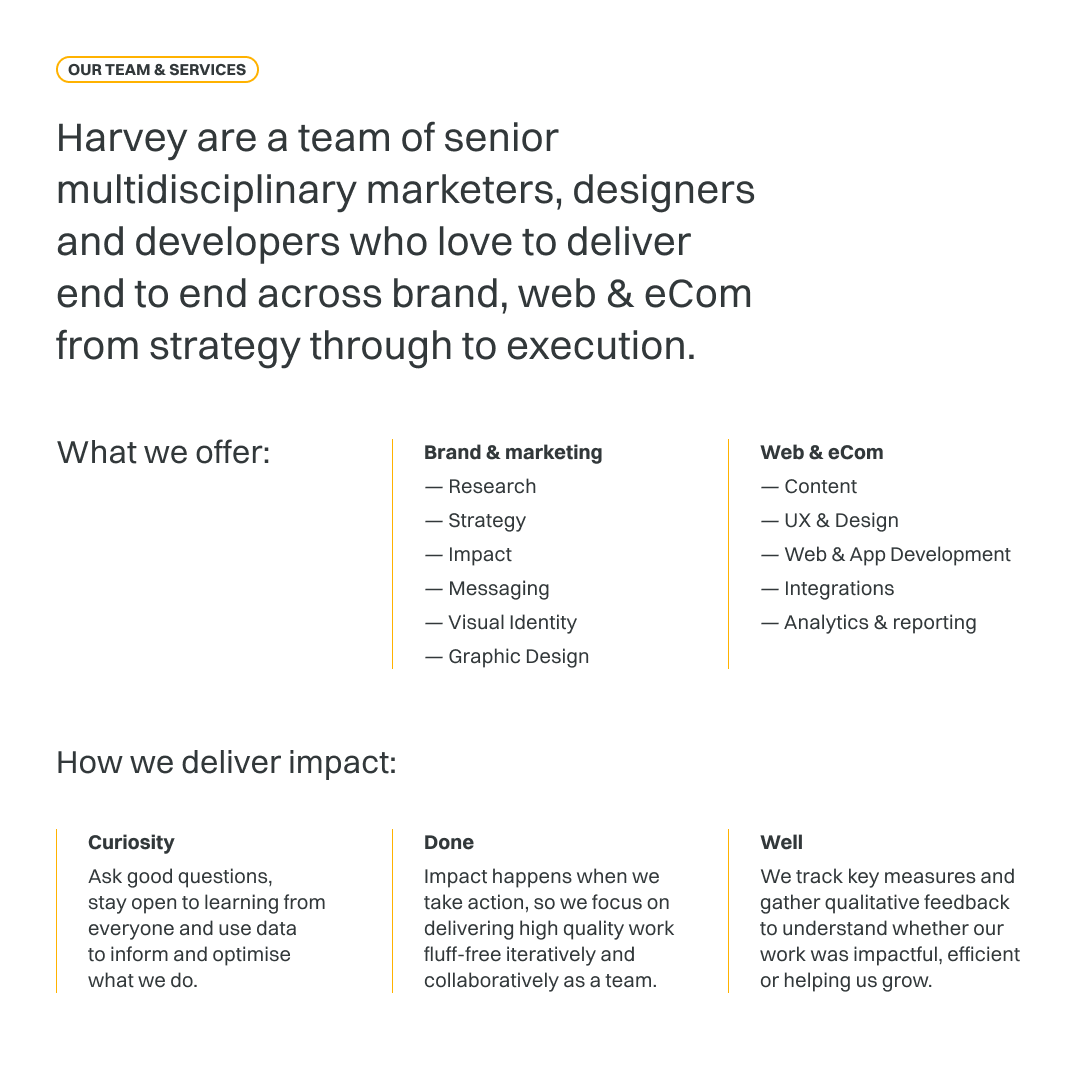 The key focus for Harvey next year is investing in team leadership and skills through ongoing training, strengthening our core service offerings in website builds, design, brand and marketing strategy, and research, and expanding our capabilities with a few key hires. We’ll continue putting clearer guardrails in place to manage scope.