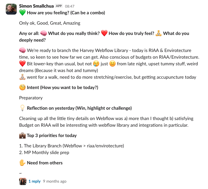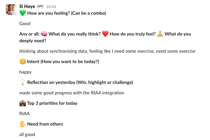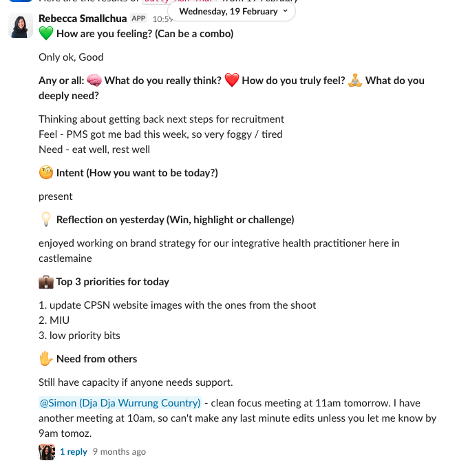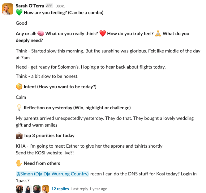 Individually sharing where we’re at that morning. We get a ping to remind us to share how we’re feeling/thinking/needing, how we intend to be today, our intent for the day, reflection from yesterday and priorities.